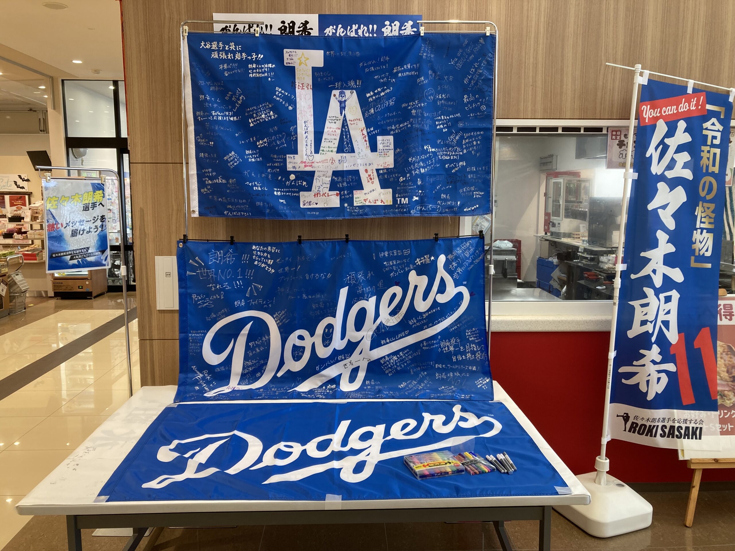 この度、大船渡アスリート応援団と共同で佐々木朗希選手の所属するロサンゼルス・ドジャースのワールドシリーズ進出に向けて応援するため、応援メッセージの書き込みをアバッセ入口付近に設置いたします。